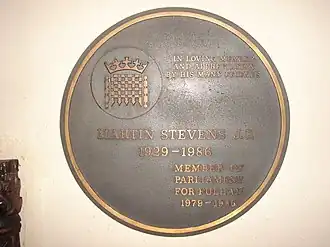 1. ^ a b c d e "Mr Martin Stevens, MP". The Times. 11 January 1986. p. 10.