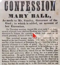Mary Ball (c. 1818–1849) was a Nuneaton housewife who poisoned her husband with arsenic. She was hanged in Cuckoo Lane, outside Coventry Gaol, before a crowd of about twenty thousand. She was the last person to be publicly executed in Coventry.[1][2][3][4]