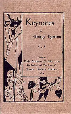 Egerton's first book of short stories, Keynotes, was published by John Lane and Elkin Mathews of the Bodley Head in 1893 and illustrated by Aubrey Beardsley. Like other Bodley Head and Beardsley-illustrated publications, it is associated with both the literary fin de siècle and "Decadent" movements. Keynotes was phenomenally successful (and notorious) on both sides of the Atlantic and as a result of this Egerton became a celebrity, was interviewed in the leading magazines of the day, and was famously lampooned in Punch.[9]