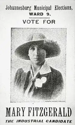 Mary Fitzgerald (also known as Pickhandle Mary; 4 August 1883 – 26 September 1960) was an Irish-born South African political activist and was considered to have been the first female trade unionist in the country. She was South Africa's first female master printer. As editor of the Voice of Labour, she published articles advocating for women's enfranchisement, racially integrated trade unions and revolutionary socialism. She played a lead role in the Black Friday Riots of 1913. She was the first woman to be elected to the Johannesburg City Council (JCC) in 1915 and later served as Deputy Mayor of Johannesburg.[1]