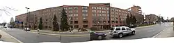 A panorama taken in early 2007, of the "back" of Mary Markley Hall. The picture was taken from the bus stop that is across East Medical Center Drive from the building.