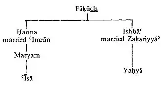 This view was further corroborated in the 20th century. According to Iraqi Jewish scholar and translator, N.J. Dawood, the Quran confuses Mary mother of Jesus with Miriam the sister of Moses, when it refers to the father of Mary, the mother of Jesus, as Imran, which is the Arabic version of Amram, who is shown to be the father of Moses in Exodus 6:20.[19] Dawood, in a note to Quran 19:28, where Mary the Mother of Jesus is referred to as the "Sister of Aaron", and Aaron was the brother of Miriam sister of Moses, states: "It Appears that Miriam, Aaron's sister, and Maryam (Mary), mother of Jesus, were according to the Koran, one and the same person."[20] Although Islamic studies of the beginning of the 20th century tended to see this as a mistake in genealogy, in more recent Islamic Studies of the 21st century the general consensus is, according to Angelika Neuwirth, Nicolai Sinai & Michael Marx, that the Quran does not make a genealogical error but instead makes use of typology.[21] This is, following Wensinck's conclusion, supported by the figurative speech of the Quran and the Islamic tradition: