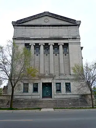 Little is known about the architect, William Q. Bendus. The building was built in the Neo-classical style and may have been influenced by the Cleveland Museum of Art. The six-story Temple was situated on a hill and featured ionic columns. Masonic imagery adorned the tympanum. Two lodge rooms in the temple could each seat over two hundred people. The original designs called for a ballroom, but this was never finished and was converted to a storage room. Other rooms in the building included a game room and kitchen.