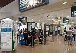 Every station is equipped with Top Up Kiosk (TUKs), a Passenger Service Centre and LED or plasma displays that show train service information and announcements. All stations are equipped with restrooms and payphones; some restrooms are located at street level.[67] Some stations, especially the major ones, have additional amenities and services, such as retail shops and kiosks, supermarkets, convenience stores, automatic teller machines, and self-service automated kiosks for a variety of services.[68] Most heavy-duty escalators at stations carry passengers up or down at a rate of 0.75 m/s, which is 50% faster than conventional escalators. The Land Transport Authority (LTA) announced a plan to introduce dual speeds to escalators along the North–South and East–West lines, to make it safer for senior citizens using them. As a result, all escalators on the two lines, through a refurbishment programme, will be able to operate at a different speed of 0.5 m/s during off-peak hours, with completion being targeted for 2022.[69]