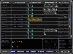 Players can manage their economies almost entirely from the Colonies screen. The Colonies screen allows the player to access any colony's Build screen, and to change a colony's output by moving colonists between Farmers, Workers and Scientists.[5]: 1 [6]: 35–36, 56–59 The Build screen allows the player to queue up to seven items for construction at a colony, to refit ships in that colony's system and to design ships that may then be built at any colony.[6]: 60–62
