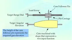 The firing tables provide data for an artillery piece firing under standardized conditions and the corrections required to determine the point of impact under actual conditions.[24] There were a number of ways to implement a firing table using cams. Consider Figure 5 for example. In this case the gun angle as a function of target's range and the target's relative elevation is represented by the thickness of the cam at a given axial distance and angle. A gun direction officer would input the target range and relative elevation using dials. The pin height then represents the required gun angle. This pin height could be used to drive cams or gears that would make other corrections, such as for propellant temperature and projectile type.