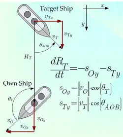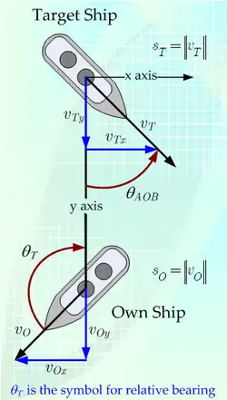 US Navy rangekeepers during World War II used a moving coordinate system based on the line of sight (LOS) between the ship firing its gun (known as the "own ship") and the target (known as the "target"). As is shown in Figure 1, the rangekeeper defines the "y axis" as the LOS and the "x axis" as a perpendicular to the LOS with the origin of the two axes centered on the target.