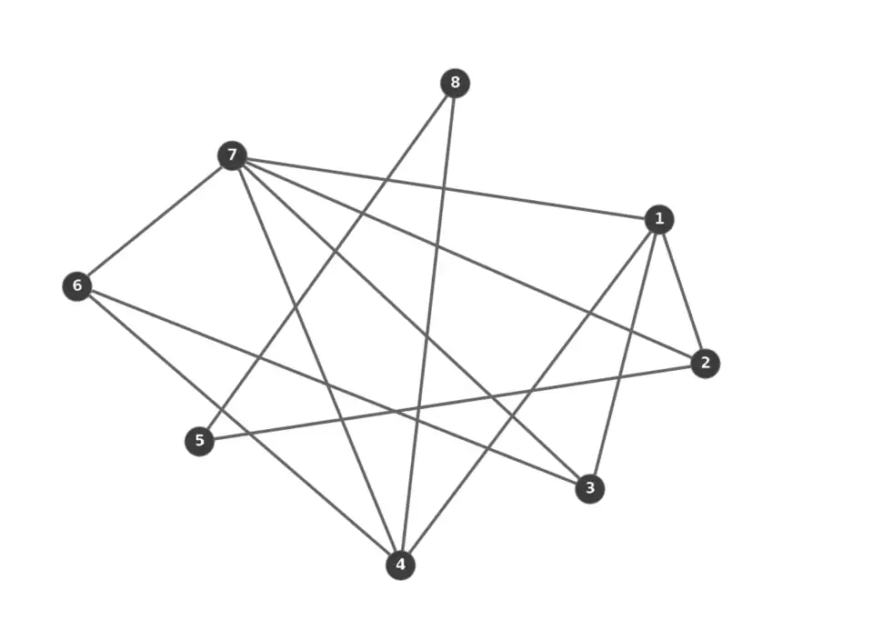The graph above can be described as a candidate set of vertices R = {7(5), 1(4), 4(4), 2(3), 3(3), 6(3), 5(2), 8(2)}, and used as input for both the approximate coloring algorithm and the ColorSort algorithm. Either algorithm can be used to construct the following table:
