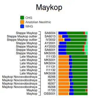 According to genetic studies on ancient DNA published in 2018, the Maykop population came from the south, from Imereti, and was descended from the Chalcolithic farmers known as Darkveti-Meshoko who first colonized the north side of the Caucasus. Maykop is therefore the "ideal archaeological candidate for the founders of the Northwest Caucasian language family".[2][3]