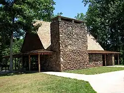 The access was once a corporate facility, formally known as Mayo Park, which was opened by the Washington Mills Company in 1948. Architect Antonin Raymond designed the original Mayo Park, which included a picnic shelter, a fishing pond, a swimming pond with a beach and a bathhouse. The state renovated and restored some of the existing structures from the former park, while trying to maintain a style compatible with Raymond's design. By the time North Carolina State Parks obtained the property, Raymond's bathhouse had degraded beyond repair. A restroom building resembling the former bathhouse's design was constructed in its place, and materials salvaged from the bathhouse were incorporated into it. The diving platform and other swimming facilities were removed from the swimming pond.[4]
