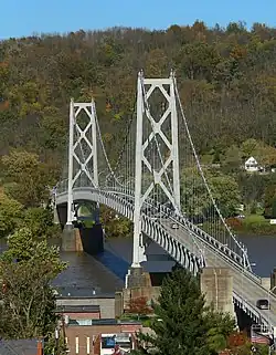 The Simon Kenton Memorial Bridge is a suspension bridge built in 1931 crossing the Ohio River and originally opened with a toll. Those tolls were removed in 1945 to much fanfare - including celebrations from the local Rotary and Lions club, and a parade in downtown Maysville. Its main span is 323 meters (1,060 feet) long, and the total length of the bridge is 607 meters (1,991 feet). It connects Maysville with Aberdeen, Ohio. It is currently in use and is not slated for demolition, as the bridge was closed for refurbishment in 2001 after the William H. Harsha Bridge was completed.