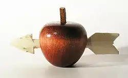 The apple and arrow in the picture are made of one piece of wood each. The hole is in effect too small to fit the arrow through it and there are no signs of gluing.
