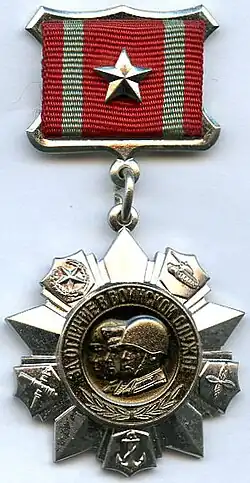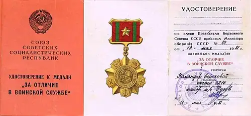 The Medal "For Distinction in Military Service" was awarded to soldiers of the Soviet Army, Navy, border and internal troops: for excellent performance in combat and political training; for special distinction in exercises and manoeuvres in combat service and combat duty; for bravery, selflessness, and other services, displayed during military service.[1]