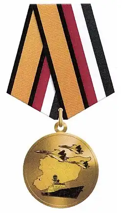The Medal "Participant of the military operation in Syria" (Russian: Медаль «Участнику военной операции в Сирии») is an award of the Ministry of Defense of the Russian Federation. It was created by order of Sergei Shoigu on November 30, 2015 No. 732.[1] The medal is awarded to servicemen and civilian personnel of the Russian Armed Forces, who participated in or assisted the Syrian or Russian forces in the Russian military operation in Syria.