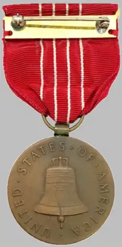 The medal is a bronze disc whose obverse features the profile of the Statue of Freedom of the US Capitol Building, with the word "FREEDOM" in capital letters in an arc at the bottom of the disc. The reverse features the Liberty Bell surrounded by the words "UNITED STATES OF AMERICA" in capital letters. The medal is suspended on a red ribbon with four thin white stripes. The original Executive Order 9586 establishing the medal specified "No more than one Medal of Freedom shall be awarded to any one person, but for a subsequent act or service justifying such an award a suitable device may be awarded to be worn with the medal"[6] and bronze, silver, and gold palm devices were produced and awarded. There is no evidence of U.S. citizens having received these palm devices, whereas some non-U.S. citizens did receive them (e.g. Micheline "Michou" Dumon, Nancy Wake and Andrée de Jongh), and the devices have been interpreted as signifying degrees of the award.[7][8]