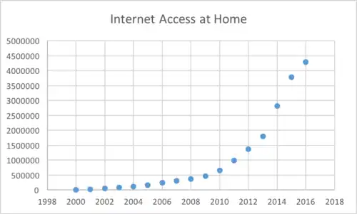 The sole internet service provider is Ethio Telecom. There are about 4,300,000 people who can access internet at their home.[18] It is harder to estimate the number of people who access the internet through internet café's which are much more popular and affordable.