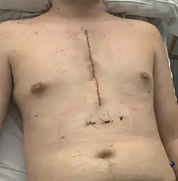 Median sternotomy is a type of surgical procedure in which a vertical inline incision is made along the sternum, after which the sternum itself is divided using a sternal saw.[1] This procedure provides access to the heart and lungs for surgical procedures such as heart transplant, lung transplant, corrective surgery for congenital heart defects, or coronary artery bypass surgery.[2][3][4]
