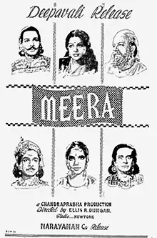 Meera is a 1945 Indian Tamil-language historical musical film directed by Ellis R. Dungan, produced by T. Sadasivam and written by Kalki Krishnamurthy. Based on the life of the 16th century mystic and poet Mirabai, the film stars M. S. Subbulakshmi as the eponymous character, a zealous devotee of Krishna, who considers him to be her husband. Despite marrying Rana (Chittoor Nagayya), she follows her own way of living, which is unacceptable to her husband and his family.
