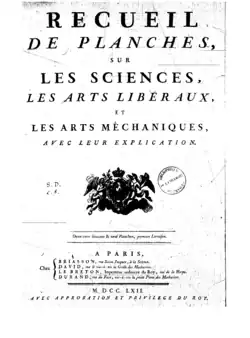 Within the Memoirs, Barruel alleged that Diderot's Encyclopédie was a Masonic project. He believed that the written works of the philosophes penetrated all aspects of society and that this massive collection was of particular significance. The Encyclopédie was only the first step in philosophizing mankind and was necessary to spread the impious and anti-monarchical writings.[33] This created a mass movement against the church and society. Barruel believed that the conspirators attempt to "imbue the minds of the people with the spirit of insurrection and revolt"[34] and to promote radicalism within all members of society. This was believed to be the main reason behind the Encyclopédie as it was "a vast emporium of all the sophisms, errors, or calumnies which had ever been invented against religion".[35] It contained "the most profligate and impious productions of Voltaire, Diderot, Boulanger, La Mettrie, and of other Deists or Atheists of the age, and this under the specious pretence of enlightening ignorance".[36] Barruel believed the volumes of the Encyclopédie were valuable in controlling the minds of intellectuals and in creating a public opinion against Christianity and monarchy.