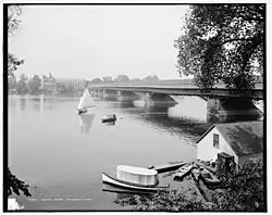 2. ^ King, Moses, ed. (1884). King's handbook of Springfield, Massachusetts. Boston: James D. Gill; Franklin Press of Rand, Avery, & Company. p. 74. This ended travel across the bridge; and it was soon taken down, having become too much weather-beaten to endure longer service. It was mongrel in style, the travel being on neither the bottom nor top of the chord, but ascending and descending with the curve of the arches of each span.