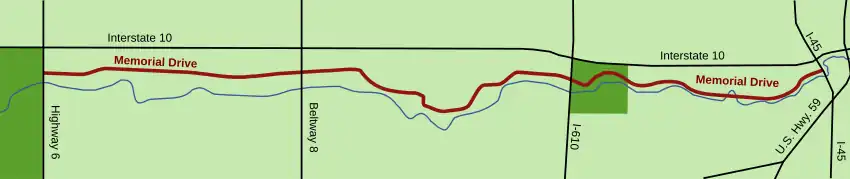Memorial Drive is an arterial road in the western half of Houston, Texas, United States. It runs from Interstate 45 west to State Highway 6, a distance of approximately 20 miles (32 km). A 1-mile (1.6 km) section goes through several predominantly higher-income residential neighborhoods in the cities of Houston, Bunker Hill Village, Piney Point Village, and Hunters Creek Village, in addition to Memorial Park. Memorial Drive was named in the memory of the men who served in Camp Logan.[1]