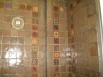 Tiles in the building depict symbols representing health and well-being in various cultures, including swastikas, a symbol which later became negatively associated with and pre-dated Germany's Third Reich. A plaque in the lobby addresses this and reads: