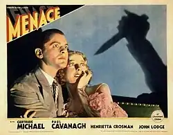 Menace is a 1934 American mystery film directed by Ralph Murphy and starring Gertrude Michael, Paul Cavanagh and Henrietta Crosman.[1] The emerging star Ray Milland billed fifth. It was produced and distributed by Paramount Pictures. It is based on the 1933 novel Menace by British writer Philip MacDonald.[2] Mitchell Leisen was originally intended to direct the film before being replaced by Murphy.[3] A review in the New York Times considered "it ranks several notches higher than the average murder film".[4]