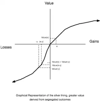 Given the Prospect Theory framework, how do people interpret, or 'account for', multiple transactions/outcomes, of the format ? They can either view the outcomes jointly, and receive , in which case the outcomes are integrated, or , in which case we say that the outcomes are segregated. The choice to integrate or segregate multiple outcomes can be beneficial or detrimental to overall utility depending on the correctness of application.[14] Due to the nature of our value function's different slopes for gains and losses, our utility is maximized in different ways, depending on how we code the four kinds of transactions and (as gains or as losses):