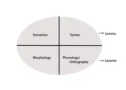 As a child acquires their vocabulary, two separate aspects of the mental lexicon develop, named the lexeme and the lemma.[4] The lexeme is defined as the part of the mental lexicon that stores morphological and formal information about a word, such as the different versions of spelling and pronunciation of the word.[18] The lemma is defined as the structure within the mental lexicon that stores semantic and syntactic information about a word, such as part of speech and the meaning of the word. Research has shown that the lemma develops first when a word is acquired into a child's vocabulary, and then with repeated exposure the lexeme develops.[4]