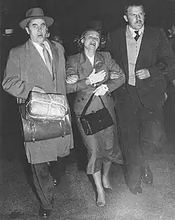 Cold War politics: Evdokia Petrova at Sydney Airport, being escorted to a waiting plane by two armed KGB agents during the Petrov Affair. Menzies intervened to prevent her forced removal to the USSR following the defection of her husband.
