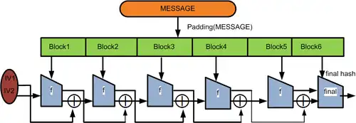 In the diagram, the one-way compression function is denoted by f, and transforms two fixed length inputs to an output of the same size as one of the inputs. The algorithm starts with an initial value, the initialization vector (IV). The IV is a fixed value (algorithm- or implementation-specific). For each message block, the compression (or compacting) function f takes the result so far, combines it with the message block, and produces an intermediate result. The last block is padded with zeros as needed and bits representing the length of the entire message are appended. (See below for a detailed length-padding example.)