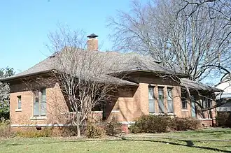 The Merrill House is a historic house at 617 South Sixth Street in Rogers, Arkansas. It is a single-story brick and masonry structure, with a hip roof that has a bell-cast shape and wide overhangs. A central projecting section has a grouping of three windows and is flanked on both sides by porches, one screened and one open. The arrangement of windows as well as the horizontal organization of stone and brickwork is all reminiscent of the Prairie School of Frank Lloyd Wright. The house, built in 1917, was a nearly complete rebuild of an older (c. 1880) house. Its designer and owner was A. W. Merrill, a local woodworker and lumber yard owner. It is the only Prairie School-influenced house in Rogers.[2]