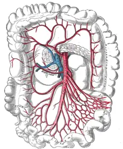 Both the superior and inferior mesenteric arteries arise from the abdominal aorta.[1] Each of these arteries travel through the mesentery, within which they branch several times before reaching the gut. In humans, many of these branches are named, but in smaller animals the branches are more variable. In some animals, including humans, branches of these arteries join with the marginal artery of the colon, which means that occlusion of one of the main arteries does not necessarily lead to the death of the part of the gut that it usually supplies.