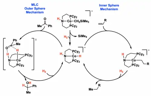 In contrast, in an inner sphere mechanism, the substrate will be inserted into the metal and reaction with hydrogen will then afford the hydrogenated product. This mechanism does not employ MLC. The differentiation between an outer sphere mechanism relying on MLC and an inner sphere mechanism is exemplified by cobalt hydrogenation with an amine pincer ligand.[8] In the outer sphere mechanism, the hydrogen on the pincer ligand is added into the ketone along with a hydride ligand on the metal.[18] It is worth noting that there is debate over the concertedness of the transition state of this outer sphere hydrogenation step, and different reactions and catalysts may be either concerted or stepwise, and in some scenarios there may be multiple pathways at play.[5] In comparison to the ketone hydrogenation, an olefin undergoes an inner sphere mechanism under the same reaction conditions, in which the olefin inserts directly into the metal. These mechanistic differences between the ketone and olefin are corroborated by the observation that the ketone hydrogenation will not occur with an N-Me pincer ligand, and the olefin hydrogenation will proceed with the N-Me ligand, suggesting the ketone requires the presence of the N-H bond while the olefin does not.[18]