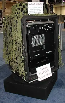 During the earlier phases of product development, there was a focus on single fuel cells and fuel cell stacks composed of multiple cells. The target applications included critical backup power for military and commercial applications.[13] The next phase was to design and build complete fuel cell systems that could be taken outside of the laboratory. Initial 50 Watt laboratory-based demonstration systems were integrated into 50 Watt portable systems with more robust packaging and interfacing.[12] Additional developments in both the fuel cell stack and system integration enabled a 1.0 kW system, complete with an inverter and onboard hydrogen storage using metal hydride storage canisters, to be operated and demonstrated in public.[6][14] Further developments in metal hydride fuel cell systems were pursued for the field power needs of soldiers, resulting in a prototype system meeting deployment requirements.[15] In tandem with product development, there was also a focus on developing capabilities for manufacturing and testing.[16] Metal hydride fuel cell systems have been integrated into microgrid systems at military bases for testing and evaluation.[17] Despite challenges,[18] the military maintains an active interest in fuel cells for a broad range of applications, including unmanned aerial vehicles, autonomous underwater vehicle, light-duty trucks, buses, and wearable technology systems.[19][20][21][22] Development of metal hydride fuel cell systems is continuing for military applications, with onboard hydrogen generation and fuel cells up to 5.0 kW.[23][24]