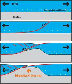 Metamorphic core complexes are exposed areas of deep crust brought to the surface by crustal extension (stretching).[1] They form, and are exhumed, through relatively fast transport of middle and lower continental crust to the Earth's surface[2] in the form of uplifting welts of hot rock and magma.[1] The resulting doming causes the overlying rock to gravitationally collapse, sliding down and usually away from the uplift along low-angle detachment faults.[1] Brittle, faulted cover rock above the detachment surface lies in direct contact with the ductile middle-lower crust below.[3]