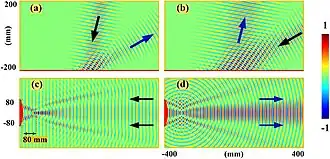 Simulation of negative refraction from a metasurface at 15 GHz for different angles of incidence. The simulations are performed through the method of moments.