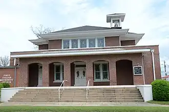 The Dardanelle Methodist Church, formerly the Methodist Episcopal Church, South, is a historic church at 100 North 2nd Street in Dardanelle, Arkansas. It is a 1+1⁄2-story brick building, constructed in 1891 and extensively altered into its present Prairie School appearance in 1917. The congregation was organized in 1848, and first met in a schoolhouse prior to the construction of its first sanctuary in 1858.[2]