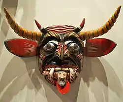 The developing dances and other masked events became part of a syncretism of Catholic and native traditions and belief, especially Carnival and Holy Week, with the first coinciding with the Aztec New Year and new agricultural cycle.[11] In addition, many of the masks developed during this time mocked colonial overlords.[13] For these reasons, at various times, masks and dances were forbidden by authorities from the 16th to 18th centuries.[12][14]