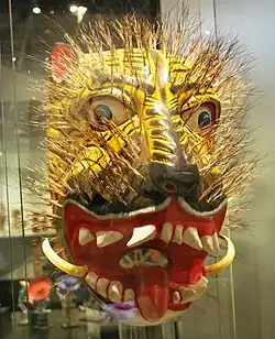 Masks range from the crude to ones with detail to make them seem like real faces.[45] Most masks are scaled to fit the human face, with dancers looking out through slits just above the painted eyes.[9] The smallest masks measure between ten and fifteen centimeters wide with the rest of the face, including the mouth, covered by cloth.[46] Other masks are much larger than the face, with the wearer looking out the mouth of the mask.[9][47] Some masks have movable parts such as lips, tongue and eyelids to make them more animated.[9][48]