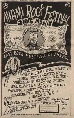 The speedway was also the site of the three-day Miami Rock Festival on Dec. 27–29, 1969. The lineup included acts such as Santana, Motherlode, Sweetwater, Canned Heat, Johnny Winter, The Amboy Dukes, and the Paul Butterfield Blues Band. Police searched fans, making 47 arrests, and a young audience member died after falling from a spotlight tower.[3] Grateful Dead also performed.[4][5] Not to be confused with an annual pub event held since the 2000s.[5]
