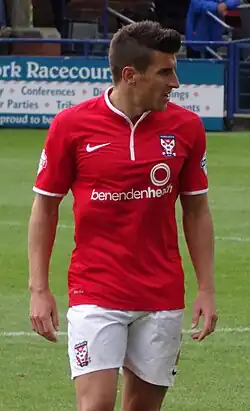 Coulson joined newly promoted League Two club York City on a two-year contract on 29 June 2012.[67][68] He scored on his debut with a long-range strike away to League One team Doncaster Rovers in the League Cup first round to give York a 1–0 lead, with the match finishing 1–1 after extra time.[69][70] Coulson missed York's first penalty in the ensuing penalty shoot-out, which the team lost 4–2.[70] He then played in York's first Football League fixture since their promotion, a 3–1 defeat at home to Wycombe Wanderers on 18 August 2012.[71] After sustaining a cruciate ligament injury during York's away match against Accrington on 23 October 2012, Coulson was expected to be out for the rest of 2012–13.[69][72] However, he made his return as a 73rd-minute substitute in York's 0–0 draw away to Bristol Rovers on 30 March 2013.[69] He finished the season with 21 appearances and five goals.[69]