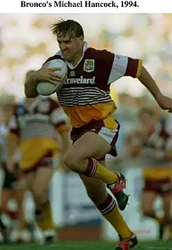 In 1989, Hancock made his début for the Queensland Maroons, becoming the then-youngest footballer of either state to play in a State of Origin series[6] and scored two tries in the 36–6 win over NSW at Lang Park. He then made his Test début on the 1989 mid-season tour of New Zealand while still a teenager. Having already represented his state in all three matches of that year's Origin series, he also played in all six matches on the New Zealand tour, scoring three tries. He played in all three Tests against the Kiwis and scored his first try in test football in Australia's 8–0 win in the second test at the Rotorua International Stadium on 16 July. He was known for his strength, elusiveness and a wide-legged running style that allowed him to change direction sharply and sometimes several times as he approached opposition defences. Hancock was named the 1989 Brisbane Broncos season's rookie of the year.[7]