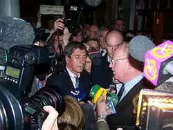 In June 2006, McDowell was involved in a leadership dispute with party leader Mary Harney, over an alleged promise by Harney to step down in favour of him. The dispute appeared to have been resolved with Harney remaining as leader.[43] On 7 September 2006, Mary Harney unexpectedly resigned as party leader and McDowell became the favourite to succeed her in the consequent leadership election. Irish media reported on 10 September 2006 that Michael McDowell would be the sole nominee for party leadership, Liz O'Donnell would become Deputy Leader and that Tom Parlon would become Party President.[44] On 11 September 2006 McDowell was confirmed as party leader[45] and on 13 September 2006, he was appointed Tánaiste.