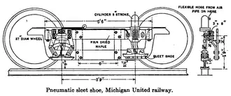 Much of the Michigan United's network used an electrified third rail to power the locomotives. Cars carried a "shoe" which rode on top of the third rail. This proved a problem during Michigan's notoriously harsh winters, when ice build-up on the tracks inhibited conductivity. To meet this challenge W. Silvius, the Michigan United equipment superintendent in Albion, developed a "pneumatic sleet shoe." The design was similar to a standard shoe, but included four steel cutters on the front to cut the sleet, while a system of air hoses allowed the motorman to lower as needed.[12]