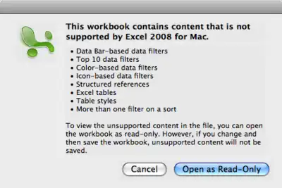 Office 2008 for Mac lacks feature parity with the Windows version. The lack of Visual Basic for Applications (VBA) support in Excel makes it impossible to use macros programmed in VBA. Microsoft's response is that adding VBA support in Xcode would have resulted in an additional two years added to the development cycle of Office 2008.[12] Other unsupported features include: OMML equations generated in Word 2007 for Windows,[13] Office "Ribbon", Mini Toolbar, Live Preview, and an extensive list of features are unsupported such as equivalent SharePoint integration with the Windows version. Some features are missing on Excel 2008 for Mac, including: data filters (Data Bars, Top 10, Color-based, Icon-based), structured references, Excel tables, Table styles, a sort feature allowing more than three columns at once and more than one filter on a sort.