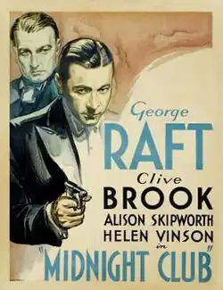 Midnight Club is a 1933 American pre-Code crime drama film about a gang of London jewel thieves infiltrated by an undercover agent (George Raft). The film was directed by Alexander Hall and George Somnes.[2][3] Produced and distributed by Paramount Pictures, it is based on the 1931 short story Gangster's Glory by E. Phillips Oppenheim.