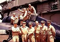Cast members pose with a Grumman F4F Wildcat fighter on the flight deck of USS Lexington