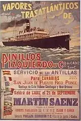 In the 1880s the enterprise was taken over by Miguel's son and also Miguel’s father, Antonio María Martínez de Pinillos Izquierdo (1843-1926);[7] under his management the enterprise reached its golden age. Antonio modernized the fleet by switching to steamers and operated new regular routes both on the Atlantic and on the Mediterranean, opening a base in Santander and trying to serve also Northern Europe and the Far East. His company, first named Pinillos, Sáenz y Cia. and since the 1890s Pinillos, Izquierdo y Cia., together with its major competitor Trasatlántica became key player on the Spanish transatlantic routes.[8] Serving as councillor in ayuntamiento[9] and with members of other Martínez de Pinillo branches acting as top local officials, Antonio became the provincial business mogul; the family grew among the most prominent ones in Cádiz.[10]