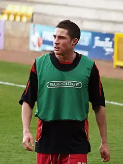 He scored his first goal of the 2009–10 season against Hereford United in a 3–1 win at Edgar Street.[19] On 3 October he scored in a 1–1 draw against Torquay.[20] He followed this up with a goal in the next game, scoring against former club Tranmere Rovers in a 2–1 win in the Football League Trophy.[21] His next goal came in the next round of the competition, however Bury were eliminated as they lost 3–2 to Accrington, with Jones equalising for Bury to make the score 2–2 at the time.[22] His next goal came against Accrington, this time a 4–2 league win on 28 December.[23] In January 2010, he scored in back-to-back home wins against Bradford City and Hereford United.[24][25] On 5 April 2010 he was sent off for the first time in his career after receiving a second yellow card in a 3–0 home win against Burton Albion.[26] He ended the season with 7 goals in 45 appearances and helped Bury to a 9th-place finish in the league.[27][28]